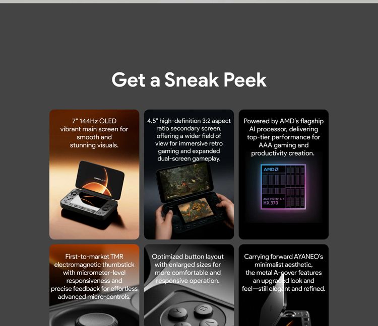 Meet the AYANEO FLIP 1S DS, the world’s first premium dual-screen gaming handheld. Designed for gamers who demand power, performance, and flexibility — it combines a stunning 7" 144Hz OLED main display with a 4.5" secondary touch screen for multitasking, monitoring, or streaming. Powered by the latest AMD Ryzen™ AI 9 HX 370 processor, it delivers lightning-fast performance in a sleek flip design.
